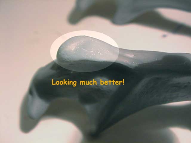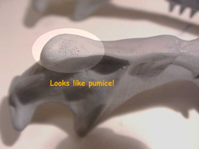 Using an old, stiff brush, I stippled the paste across a particularly badly infected kit part ( the lower jaw from Grey Zon's Godzilla Skull) and then before it dried (here's the advantage of an acrylic paste) used a piece of rag dipped in water to wipe off all the excess. Bingo! all the holes were filled and the surface was smooth - and all in a matter of seconds. After the paste had dried for an hour or so, I shot another coat of primer over the treated area and the results were perfect!